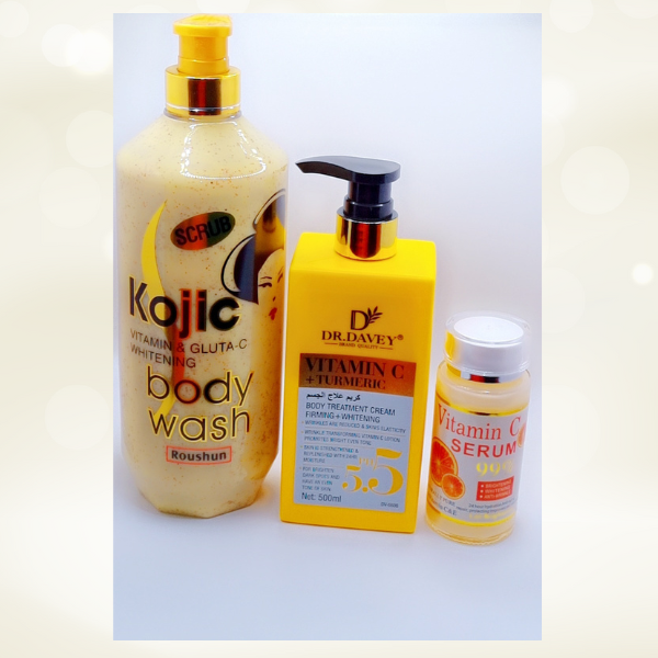 Kit Éclat Peau Parfaite 3-en-1 – Gel Douche Gommant + Sérum Vitamine C + Crème Curcuma – Anti-taches & Hydratation