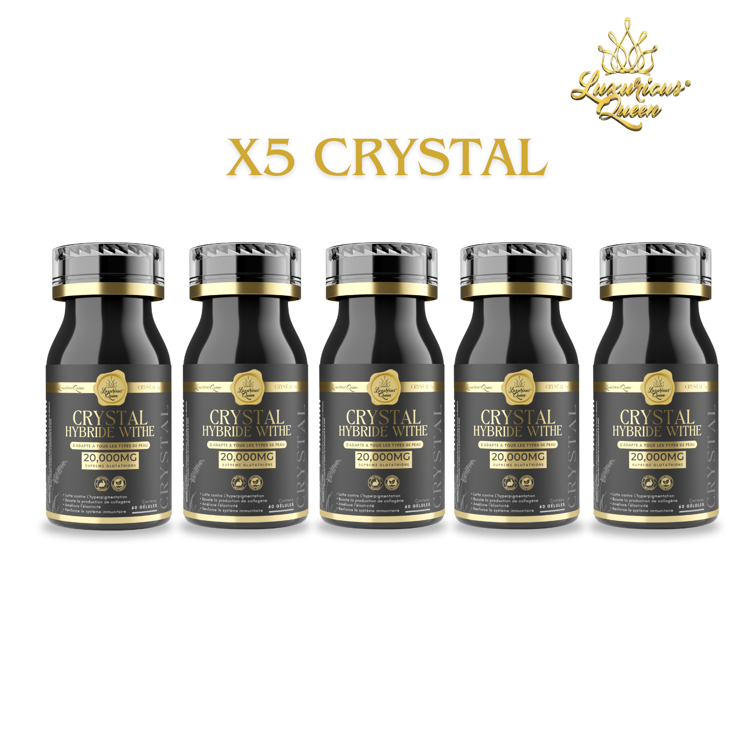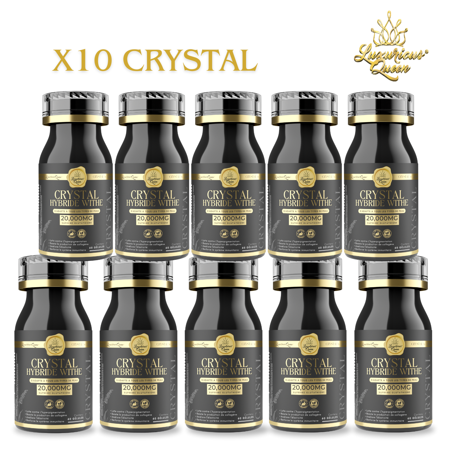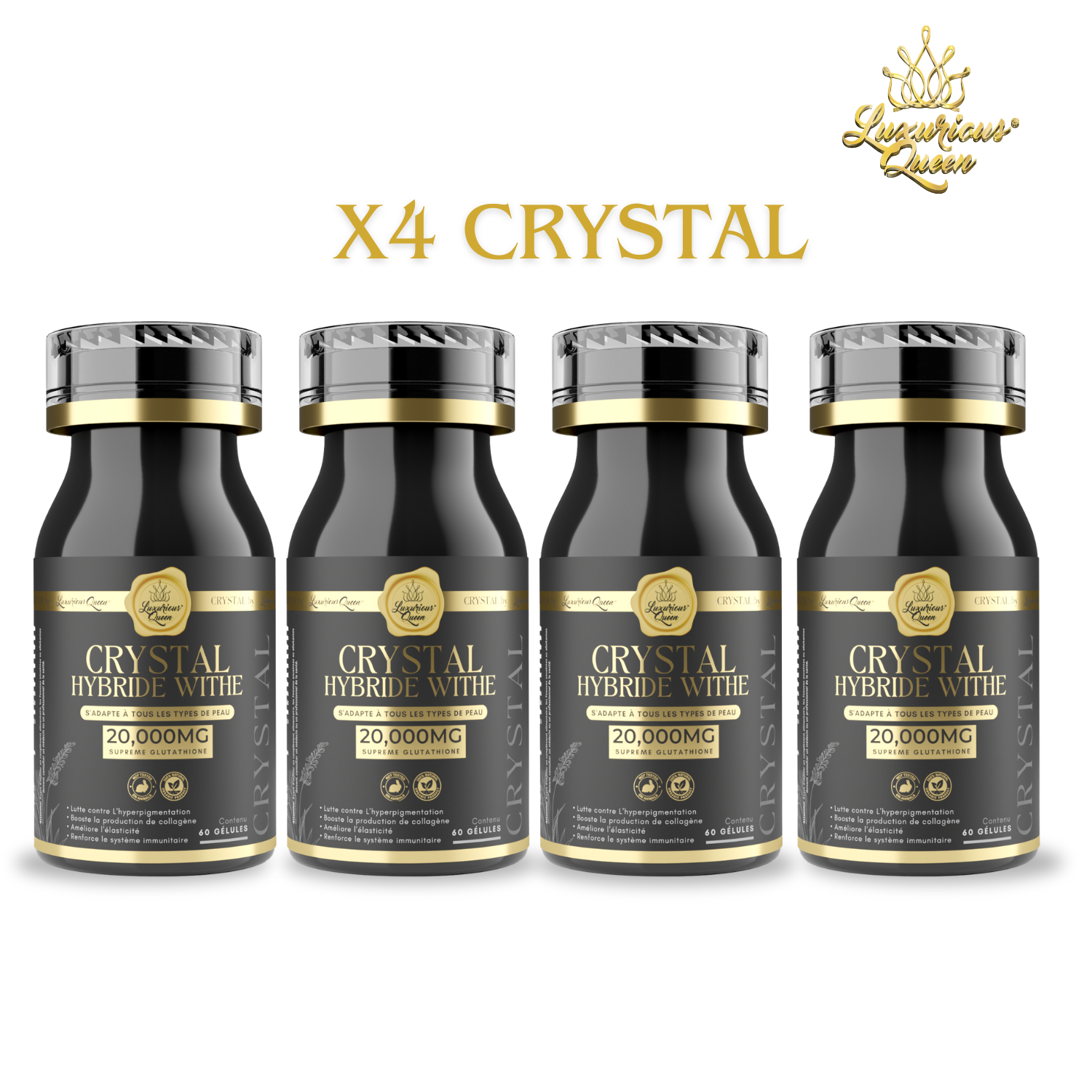 CRYSTAL HYBRIDE WITHE capsules adapt perfectly to all skin types and complexions. You just need to follow the dosage indicated according to the shade you want to obtain. Research has proven that the purer the glutathione, the better the effects in the body. Not only are our capsules made from very pure glutathione but their dosage is also very high. So that you can benefit from better performance, to fight against skin aging, stimulate the production of collagen, neutralize the production of melanin. The first results are visible after 15 days*.