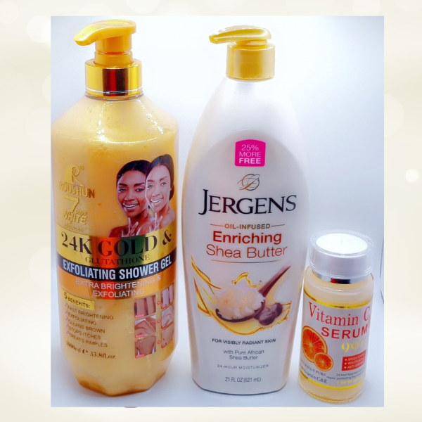 #geldoucheexfoliant #glutathione #teintlumineux #soin éclat peau noire #geldoucheor24K #crèmecorpspeausèche #beurredekarité #peaudouce #crèmehydratanteéclat